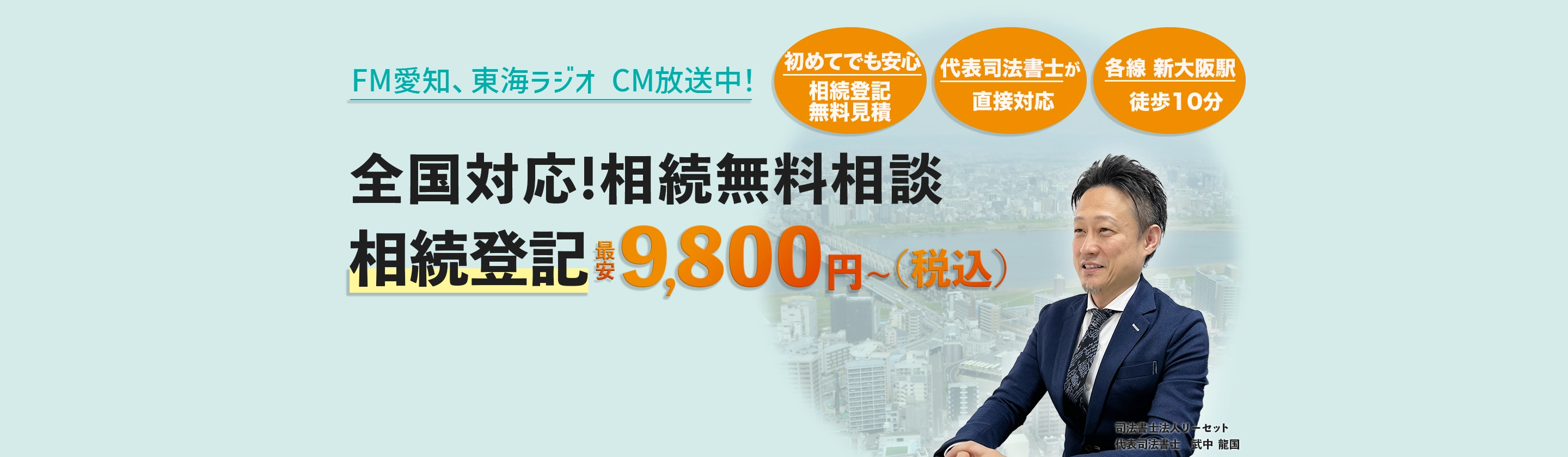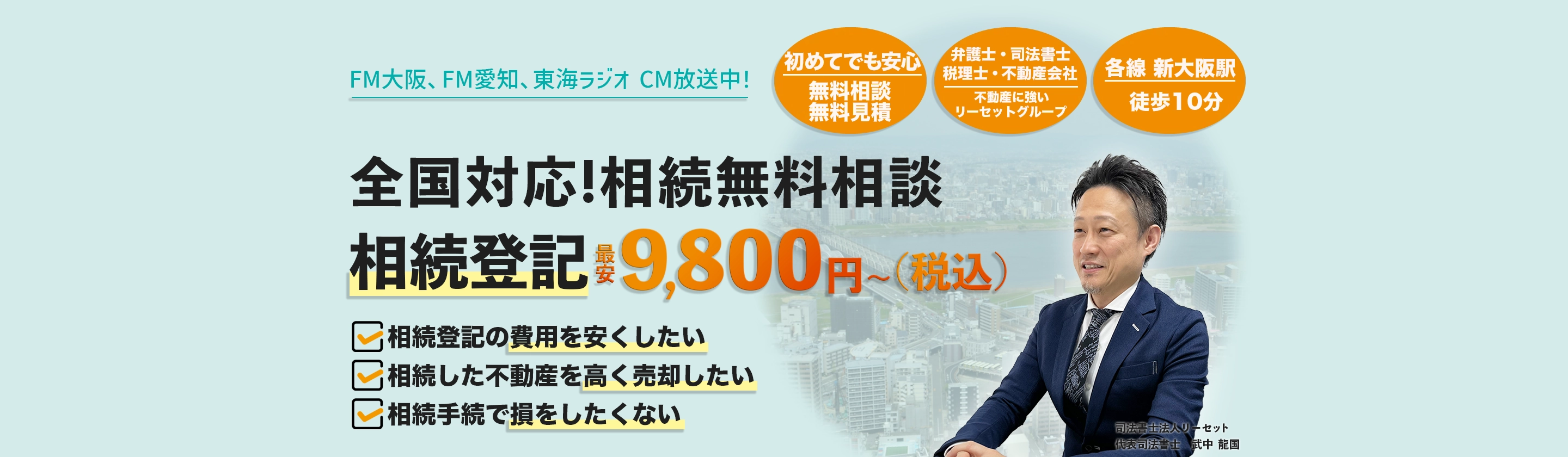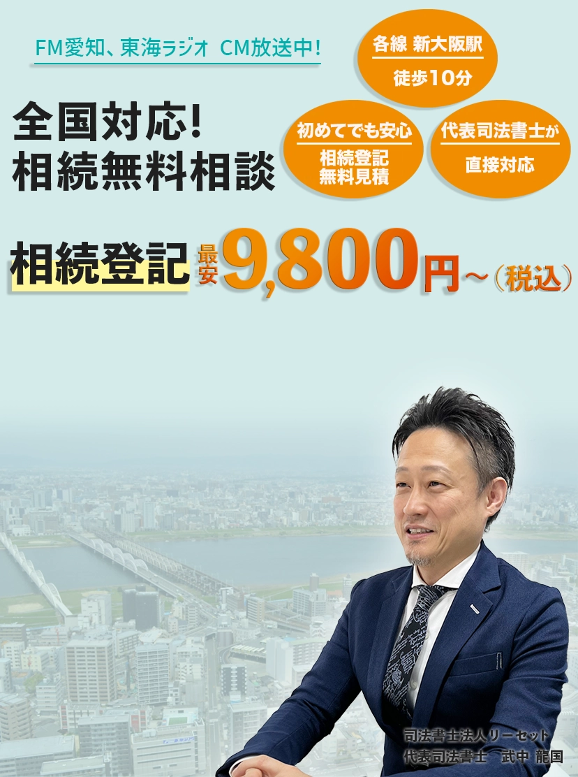 弊法人のホームページをご覧いただき、誠にありがとうございます。 司法書士の武中です。 司法書士歴は約23年になり、これまでに2万人を超える方から依頼を受けてきました。私が司法書士試験に合格した当時、4歳だった息子は現在弁護士として大阪の弁護士事務所で働いており、時の流れはものすごく早いと日々実感しております。 リーセットグループには、相続に関する各専門家が在籍しており、相続問題を解決、予防する力がございます。また、ご相談、お見積は無料で対応しており、売却サポートプランを活用した相続登記の申請報酬に関しては、全国で一番リーズナブルであると自負しております。ぜひお気軽にご活用ください。 皆様からのご依頼を心よりお待ちしております。